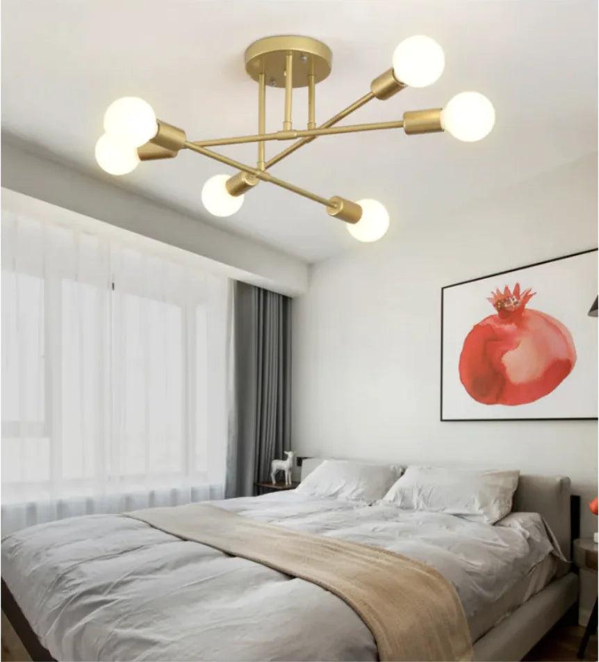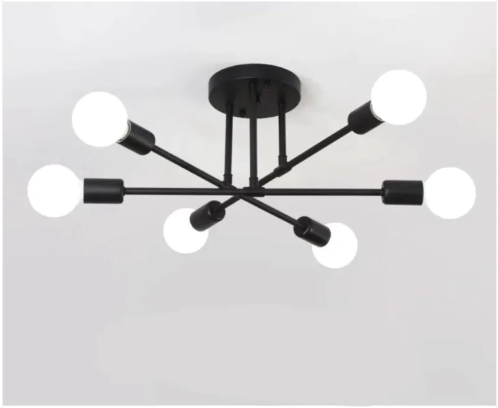 Modern industrial-style 6-head iron ceiling light suitable for bedrooms, living rooms, and dining rooms. Available in multiple colors and lighting styles.